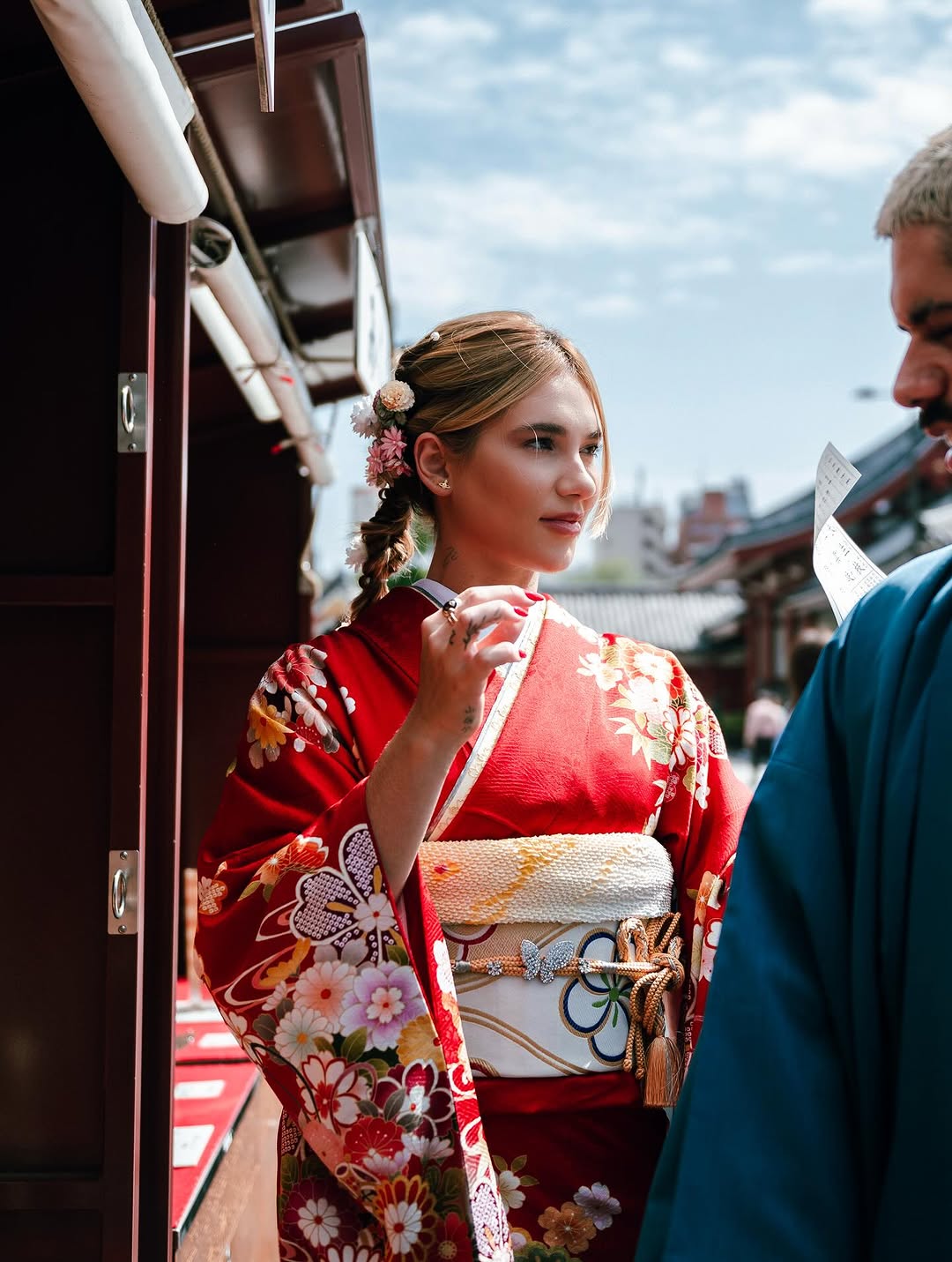 Para viver a experiência de forma autêntica, ambos usaram trajes típicos. Virginia surgiu deslumbrante em um quimono vermelho com estampas florais delicadas, combinando com sandálias do tipo tamanco japonês e um penteado clássico, finalizado com uma maquiagem que seguia os padrões estéticos orientais. Já Zé Felipe optou por um haori azul sobreposto a uma hakama listrada, reforçando a elegância dos trajes típicos masculinos.